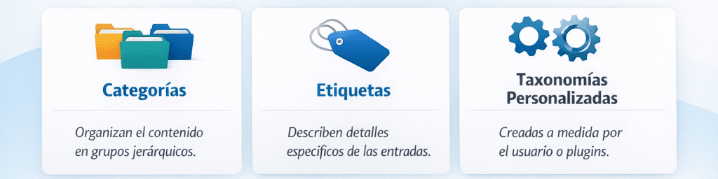 Las taxonomías personalizadas permiten crear estructuras propias adaptadas a tu proyecto. Son muy utilizadas en tiendas online o webs complejas.